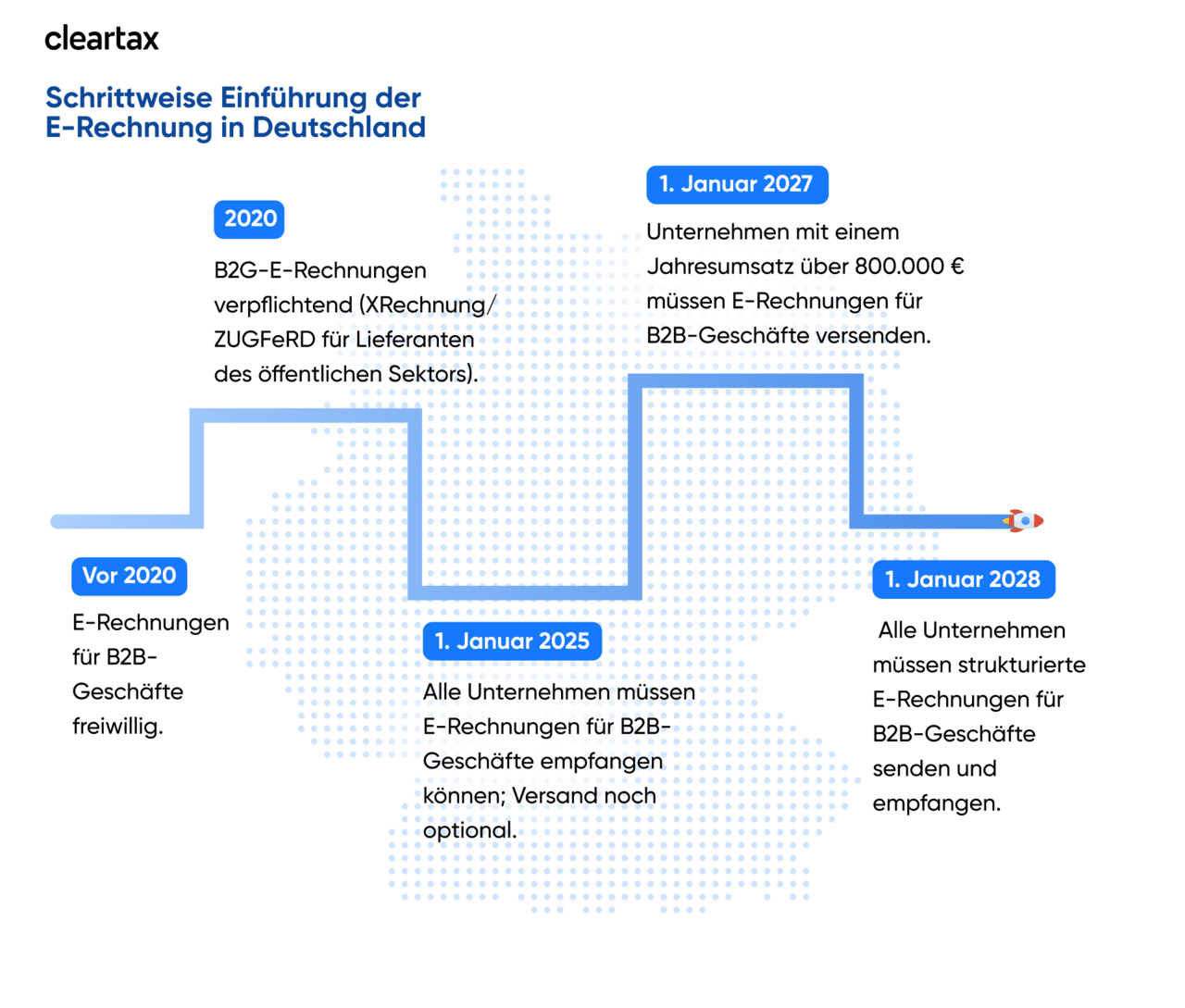 - Alle Unternehmen müssen ab Januar 2025 elektronische Rechnungen akzeptieren, die Ausstellung wird schrittweise bis zur vollständigen Umsetzung im Jahr 2028 verpflichtend.
